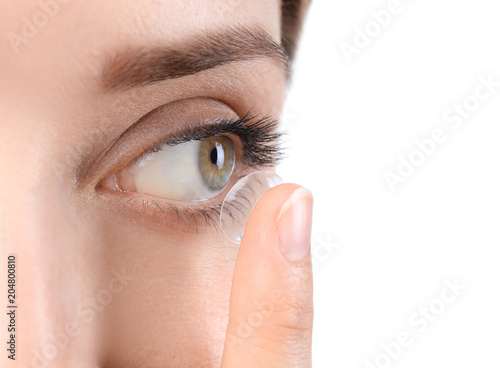 Fototapeta premium Young woman putting contact lens in her eye, closeup