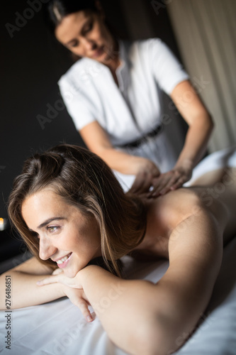 © NDABCREATIVITY, Fototapeta premium Young woman receiving a back massage in a spa center