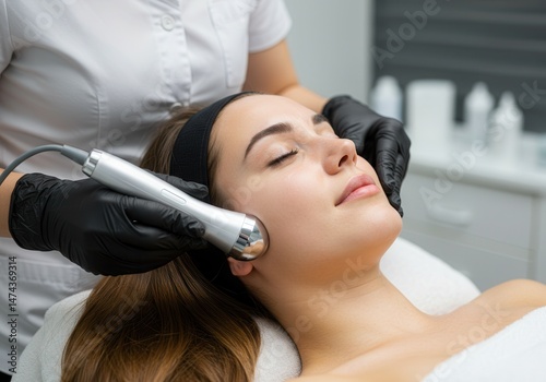 Fototapeta premium Young woman receiving a facial treatment with a modern device in a spa, eyes closed and relaxed during the procedure