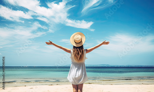 Obraz premium Young woman relaxing on a sunny beach with a hat.