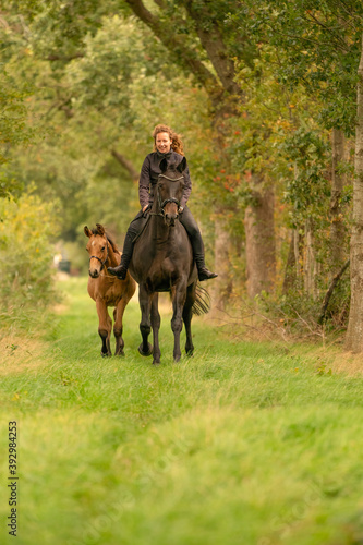 © Dasya - Dasya, Fototapeta premium Young woman riding without saddle on her beautiful brown mare, yellow foal next to them, in the autumn forest