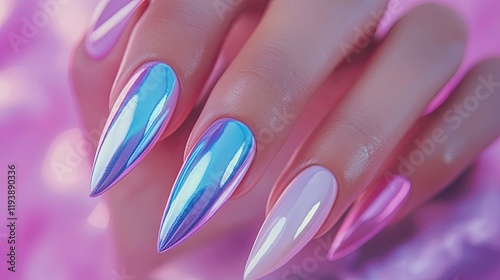 © Nuttaya Nampai, Naklejka premium Young woman's hand with colorful, innovative nail shapes, posed elegantly against a soft light background for a trendy manicure concept.