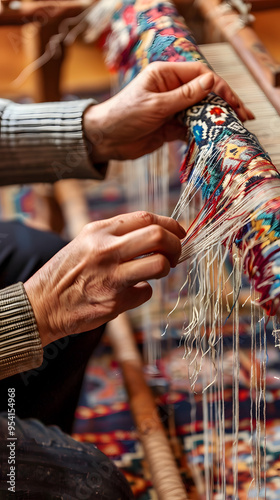© photo for everything, Obraz premium Young Woman's Hands Weaving on a Traditional Loom | Craftsmanship and Textile Art