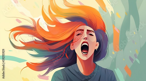 © Kai Alves, Obraz premium Young woman screaming into the air. Call for help. Emotional nervous breakdown. Mental health. Psychological pain. Cope with stress. Colorful hair flying. Generative AI.