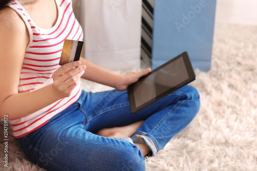 Naklejka premium Young woman shopping online with credit card and tablet PC at home