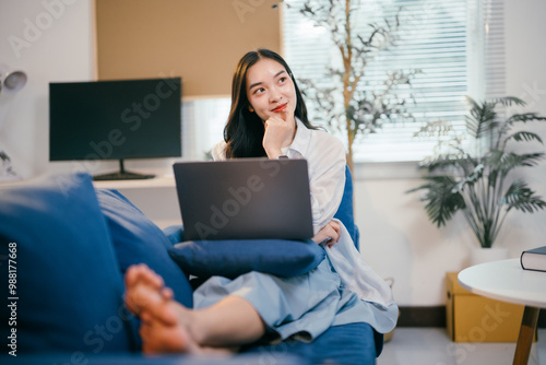 © Parichat, Naklejka premium Young woman sits comfortably on a cozy blue sofa in her living room, working on a laptop and lost in thought, finding inspiration in the comfort of her home
