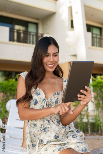 © Ranta Images, Fototapeta premium Young woman sitting and using tablet computer