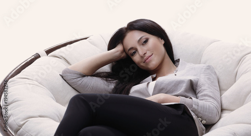 © ASDF, Fototapeta premium young woman sitting in a comfortable soft big armchair