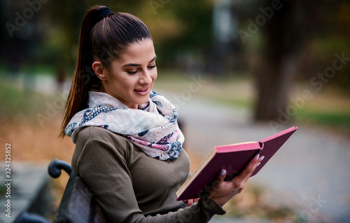 © bobex73, Obraz premium Young woman sitting in the park and reading a book. Lifestyle, education concept