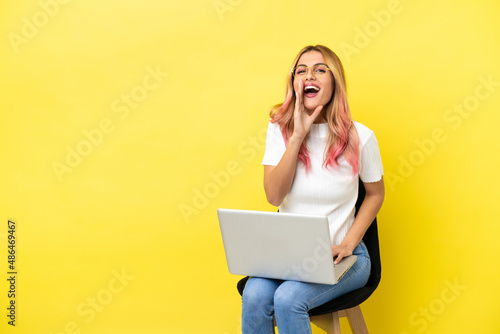 © luismolinero, Naklejka premium Young woman sitting on a chair with laptop over isolated yellow background shouting with mouth wide open