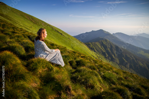 © Serhii, Naklejka premium Young woman sitting on a rock and looking to the horizon. Happy traveler enjoying sunset view. Girl in long white dress in the mountains
