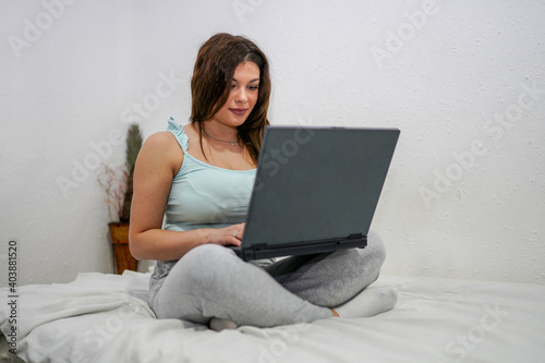 Fototapeta premium Young woman sitting on bed and surfing the net with laptop