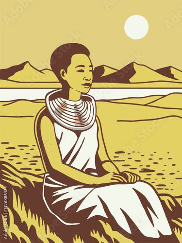 © Sam, Obraz premium Young woman sitting on the desert. Vector illustration in flat style.