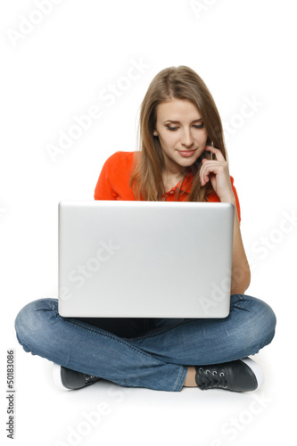 © paffy, Fototapeta premium Young woman sitting on the floor using her laptop