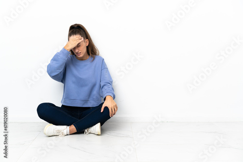 Fototapeta premium Young woman sitting on the floor with headache