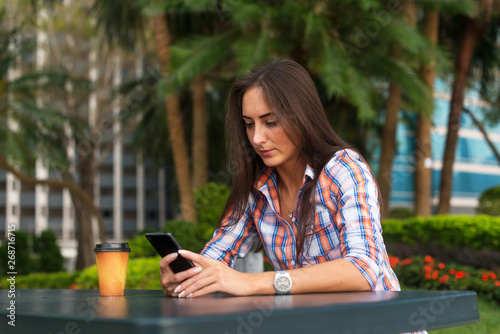 Fototapeta premium Young woman sitting outdoors reading and typing messages on her smartphone.