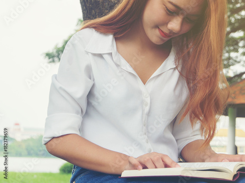 © Lealnard, Obraz premium Young woman sitting reading book at the park.