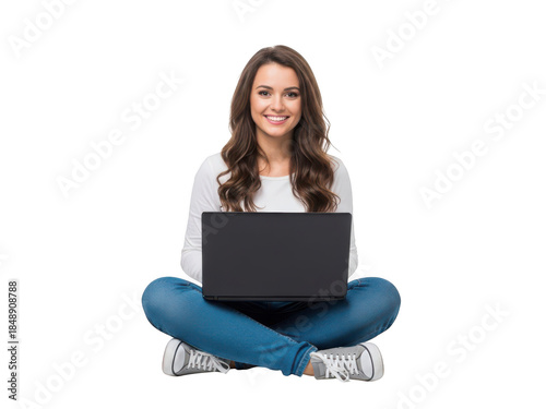 © MstMorjina, Fototapeta premium Young woman sitting with laptop isolated on transparent background