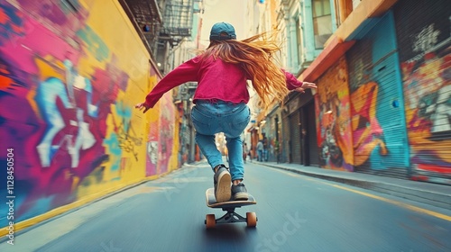 © Ruslan Gilmanshin, Naklejka premium Young woman skateboarding on vibrant graffiti street, motion blur capturing dynamic movement. Long-haired skater in red sweater and jeans against colorful urban art background