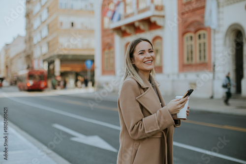 © BGStock72, Fototapeta premium Young woman smiling and holding a coffee cup on a lively city street in autumn