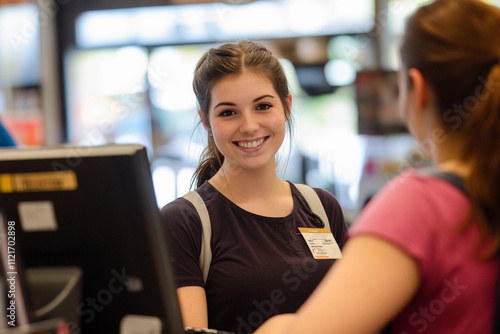 © plysuikvv, Fototapeta premium Young woman smiling at customer in retail store checkout