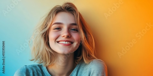 Fototapeta premium Young woman smiling brightly against a vibrant gradient background in a...