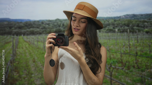 © Krakenimages.com, Obraz premium Young woman smiling face holds dslr camera and makes ok gesture in lush forest under green vines; confidence.