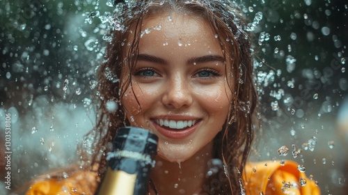 © Tatiana Vagizova, Obraz premium Young woman smiling in water with champagne bottle droplets sparkling in the sunlight. Generative AI