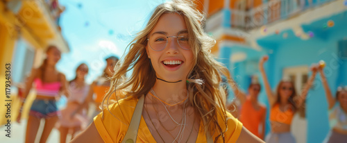 © thodonal, Obraz premium Young woman smiling joyfully in vibrant summer scene with friends