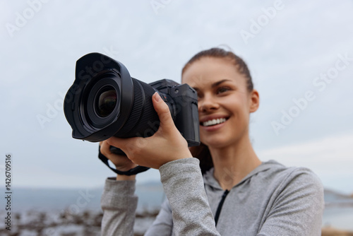 Obraz premium Young woman smiling while holding a professional camera by the beach,...