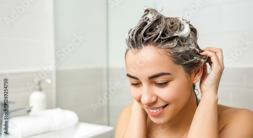 © Anna, Naklejka premium Young woman smiling while washing hair with shampoo in modern bathroom
