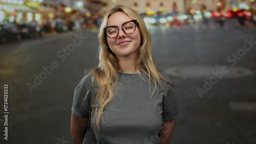 Fototapeta premium Young woman smiling with closed eyes and hands on chest, standing on a lively city street outdoor in a casual setting, exuding happiness and confidence.