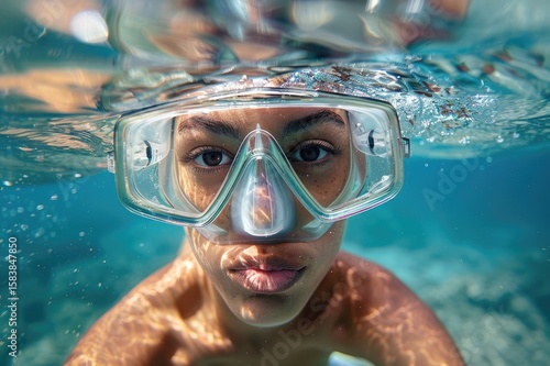 Naklejka premium Young woman snorkeling underwater in clear blue ocean