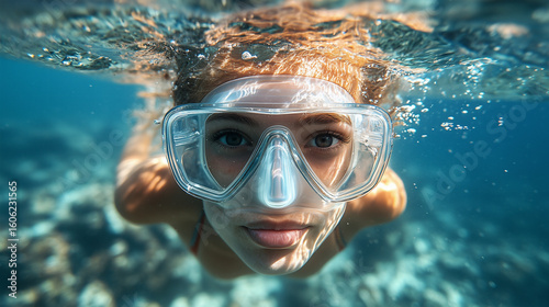 Naklejka premium Young woman snorkeling underwater in clear ocean water showcasing vibrant...