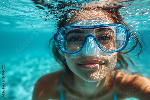 © Vladan, Fototapeta premium Young woman snorkeling underwater with blue goggles, smiling calmly as sunlight ripples across her face in clear turquoise water, creating a serene summer vacation mood.