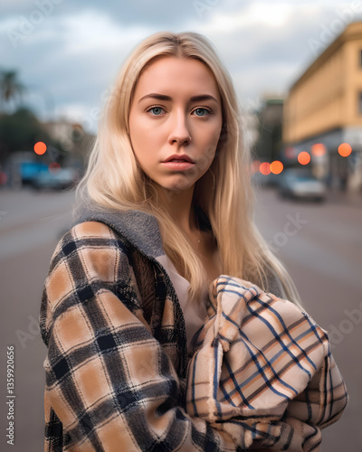 Fototapeta premium Young woman standing on urban street at dusk, wearing a plaid jacket and...