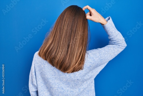 © Krakenimages.com, Fototapeta premium Young woman standing over blue background backwards thinking about doubt with hand on head