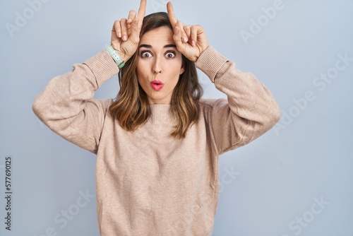 Fototapeta premium Young woman standing over isolated background doing funny gesture with finger over head as bull horns