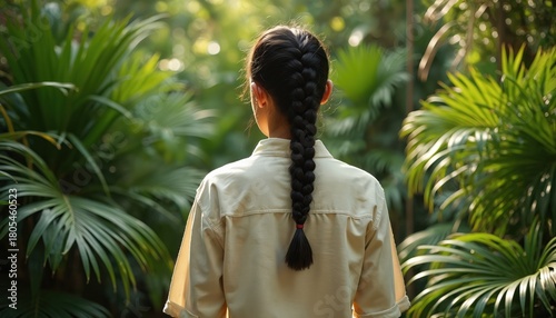 © Viktor, Fototapeta premium Young woman stands in rich green tropical plants. Long dark braid, looking at wild forest. Bright sunlight filters through leaves, creating warm outdoor setting. Person enjoys peaceful garden