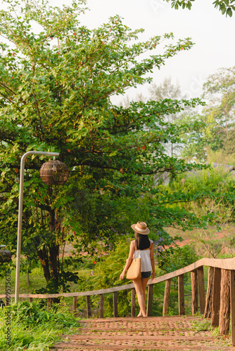 © Kaojoke, Naklejka premium Young woman step down by wooden stair in garden