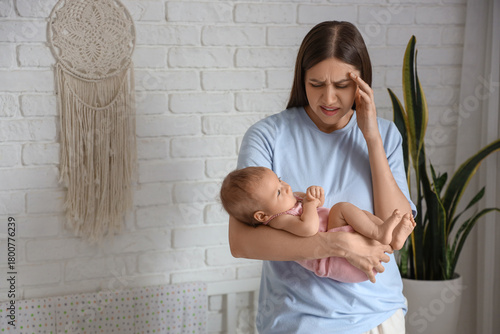 Naklejka premium Young woman suffering from postnatal depression at home