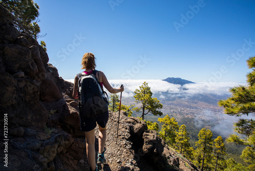 © Alberto Gonzalez , Obraz premium Young woman summit to Bejenado Peak in Caldera de Taburiente, La Palma, Spain