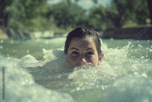 © RISHAD, Obraz premium Young woman swimming in outdoor pool surrounded by bubbles and nature