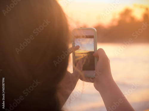 Fototapeta premium Young Woman Takes Photo At Beach on Her Smart Phone at Sunset