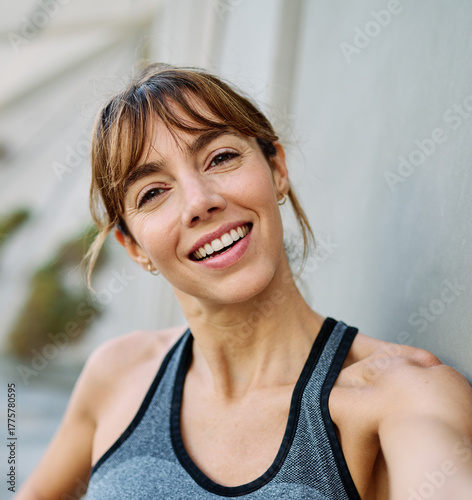 Fototapeta premium Young woman taking a selfie while posing against a wall after workout in athletic wear at urban location