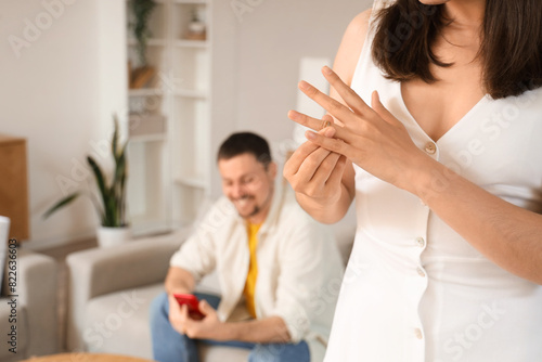 Fototapeta premium Young woman taking her wedding ring off finger at home, closeup. Cheating...