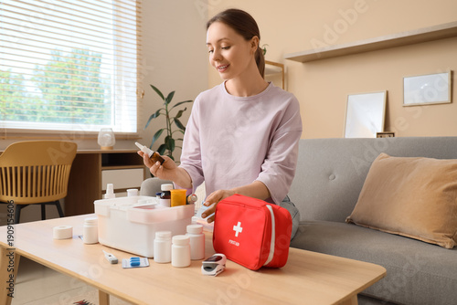 Naklejka premium Young woman taking nasal drops from first aid kit at home