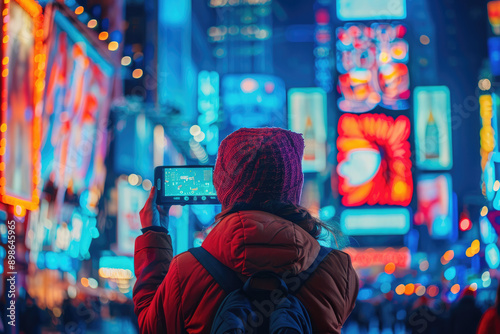 © Александр Марченко, Fototapeta premium Young woman taking photos of times square with mobile phone at night