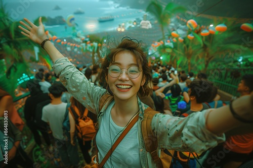 © Dreamsign, Obraz premium Young woman taking selfie at music festival with open arms