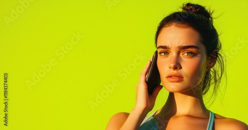 © SunPunjiStudio, Fototapeta premium Young woman talking on smartphone against vibrant green background